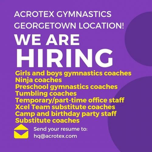 We are looking for a gymnastics coach for Pre-school through Advanced Gymnastics. We are a gym in Georgetown, TX with over 650 students.