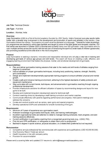 Leap Gymnastics Academy is a new gymnastics academy opening in Mumbai , India. We have two centers right now and looking at expanding rapidly. We already have 1200 students enrolled and 10 full time coaches. We are looking for someone who can oversee all our locations and train our coaches to create expetional gymnasts.